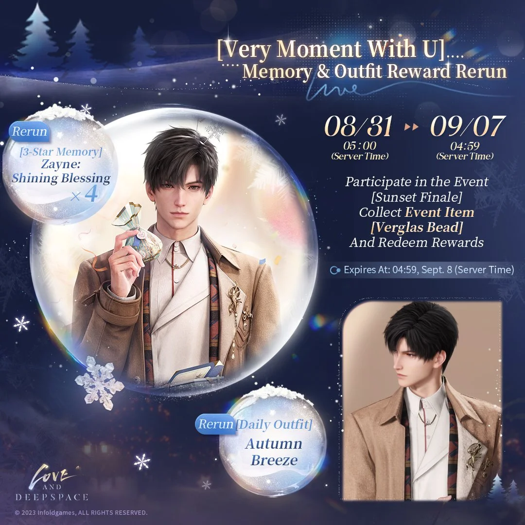 2024 birthday-exclusive 3-Star Memory [Zayne: Shining Blessing] and Daily Outfit [Zayne: Autumn Breeze] will be available in the Hope Shop.