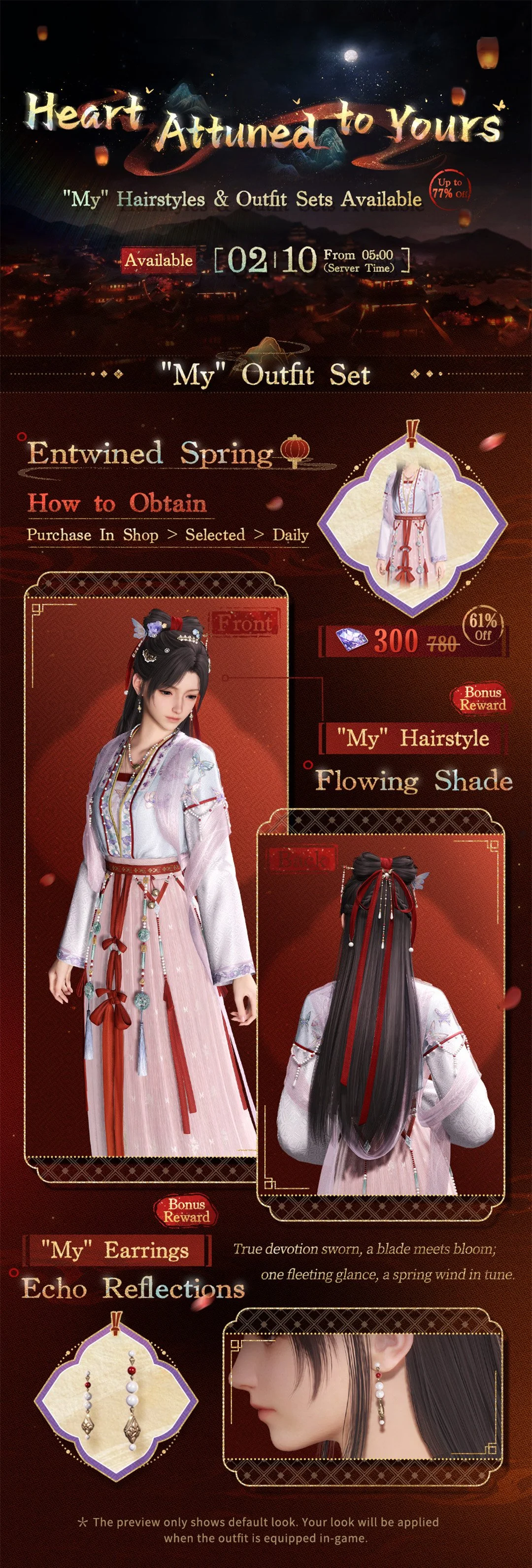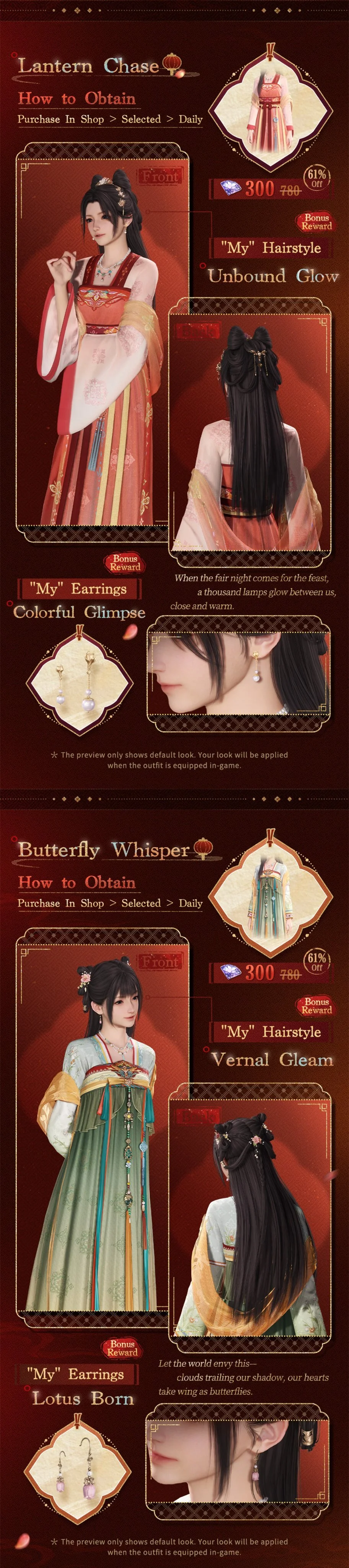 "My" Outfit Sets: Entwined Spring, Homing Swallow, Ornate Letter, Lantern Chase, Butterfly Whisper