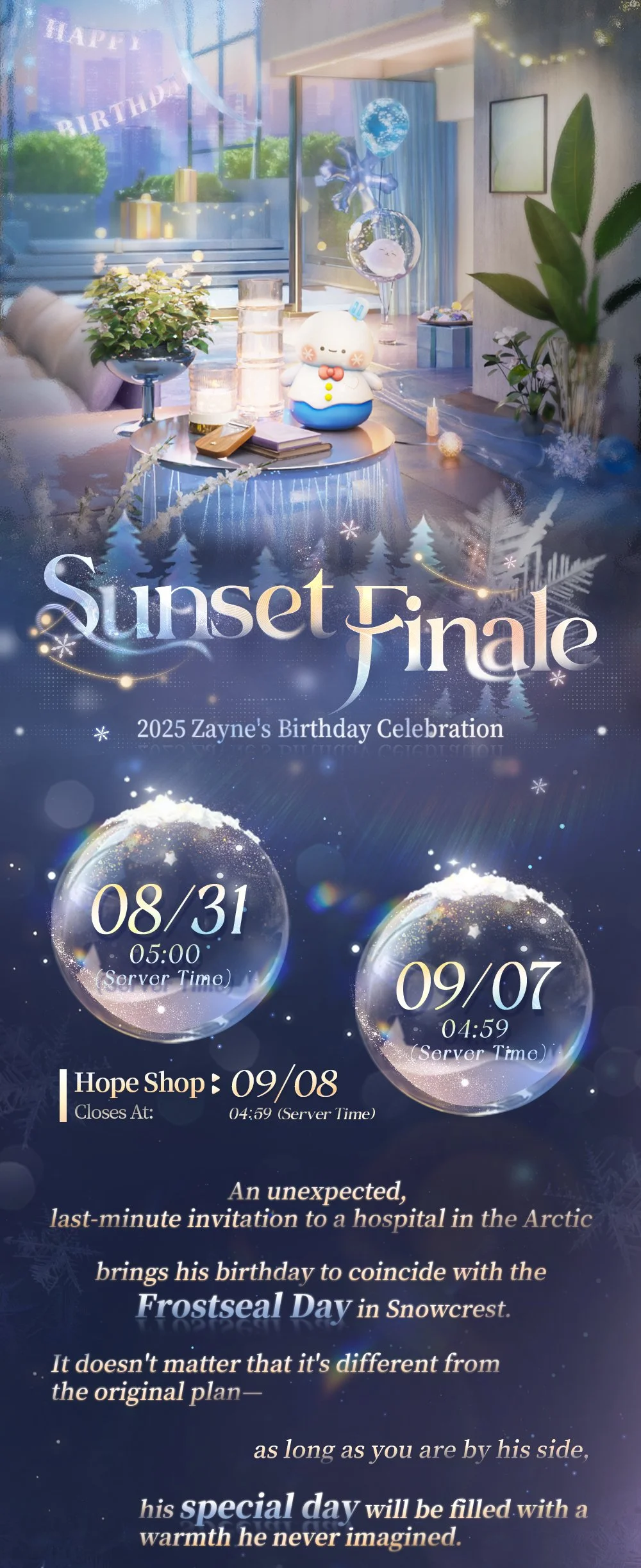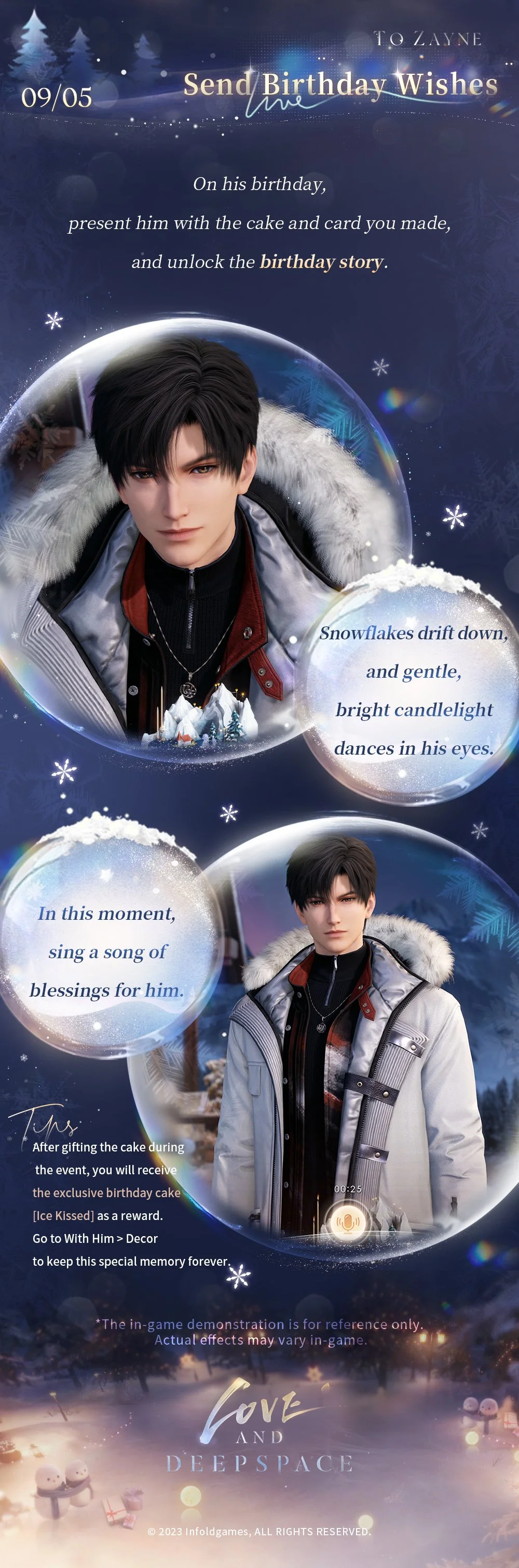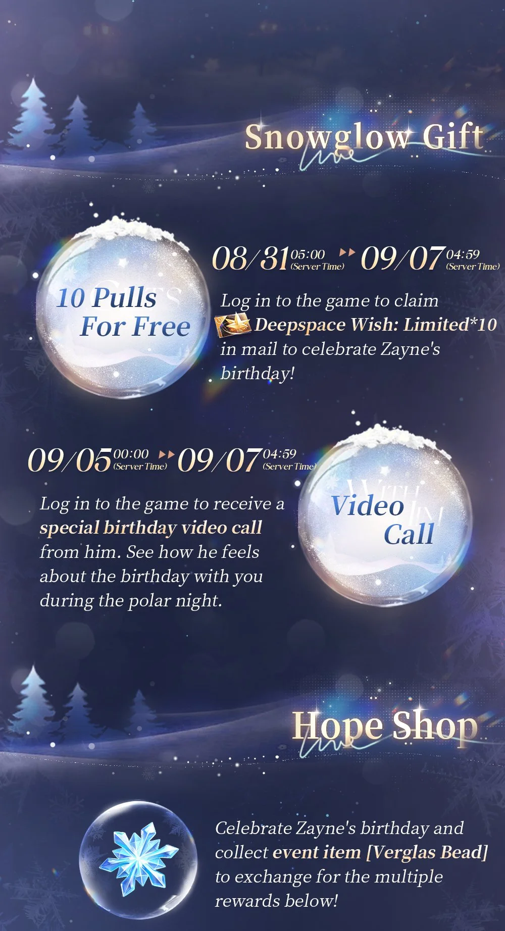 From 05:00 on Aug. 31 to 04:59 on Sept. 7 (server time), log in to the game to claim [Deepspace Wish: Limited*10] in Mail to celebrate Zayne's birthday!