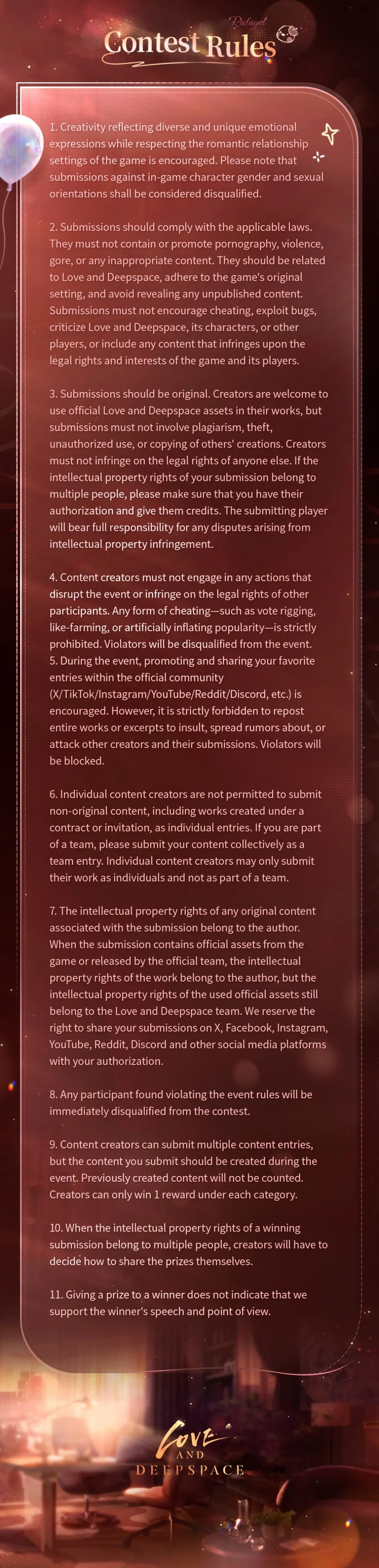 During the event, post your original artwork on X/TikTok/Instagram/YouTube/Reddit/Discord with the hashtags #LoveandDeepspace and #RafayelDuskbrightSteps to participate.