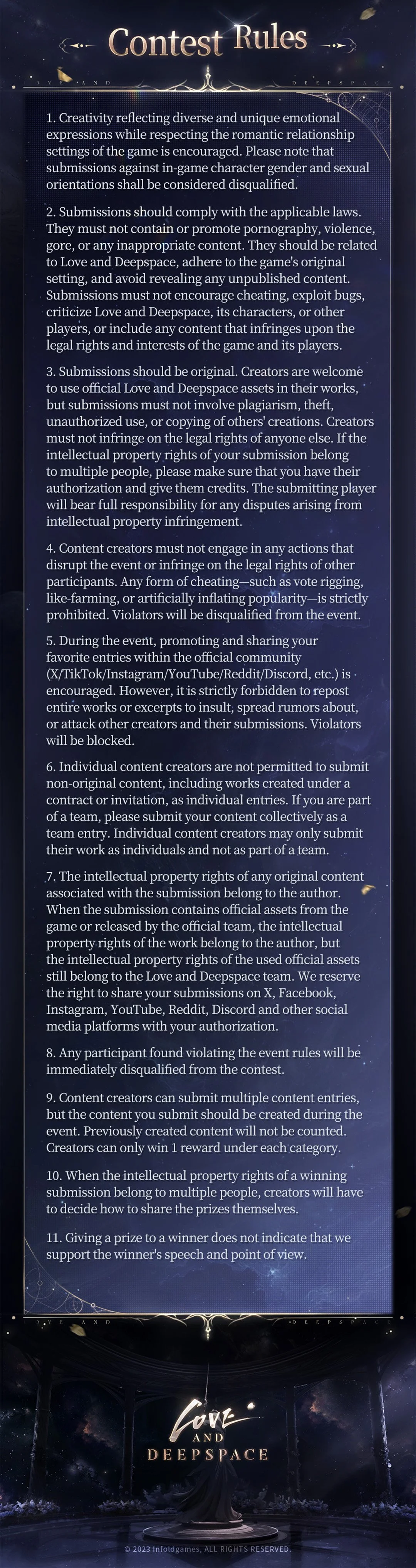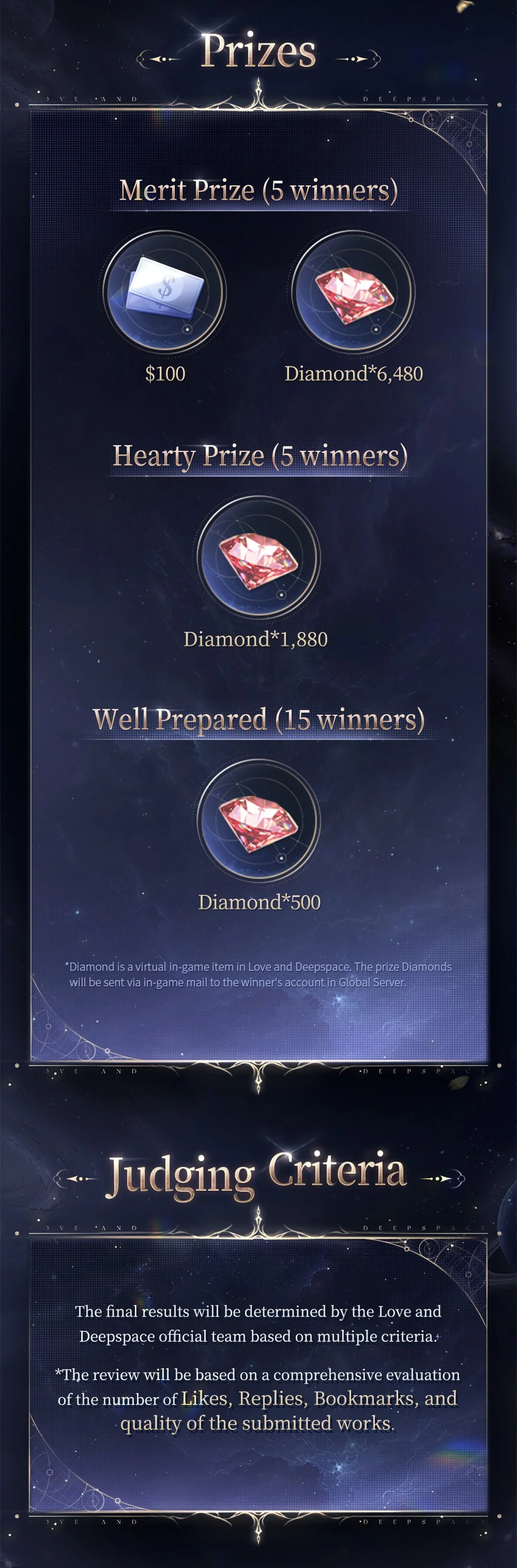 During the event, post your original work with both the hashtags #LoveandDeepspace and #LADSCosmicVerse on X/TikTok/Instagram/YouTube/Reddit/Discord, and complete the submission form as required.