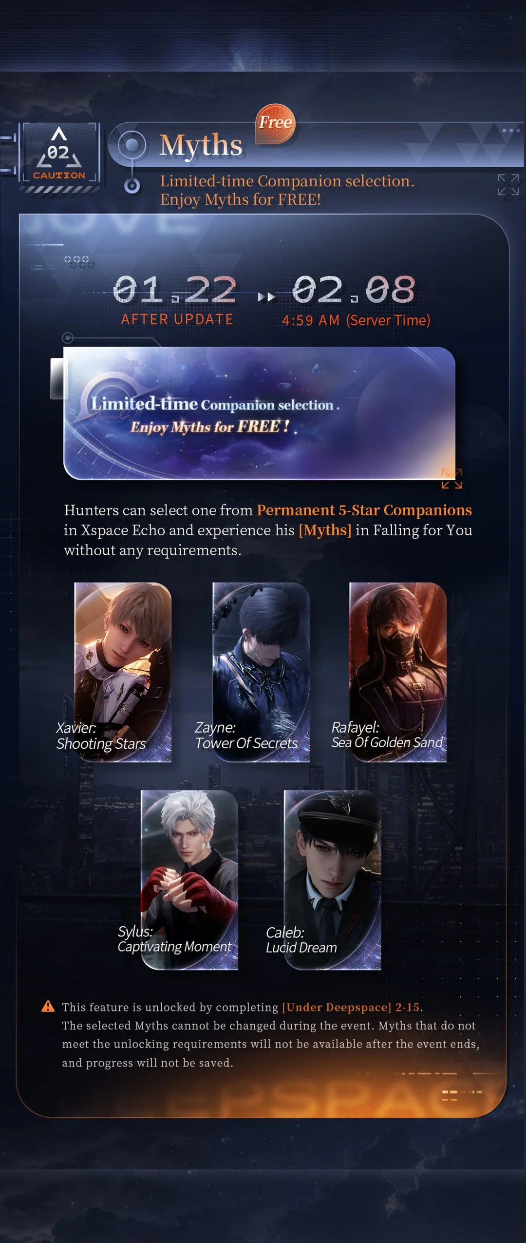 From the update on Jan. 22 to 4:59 AM on Feb. 8 (server time), Hunters can select one from Permanent 5-Star Companions in Xspace Echo and experience his [Myths] without any requirements.