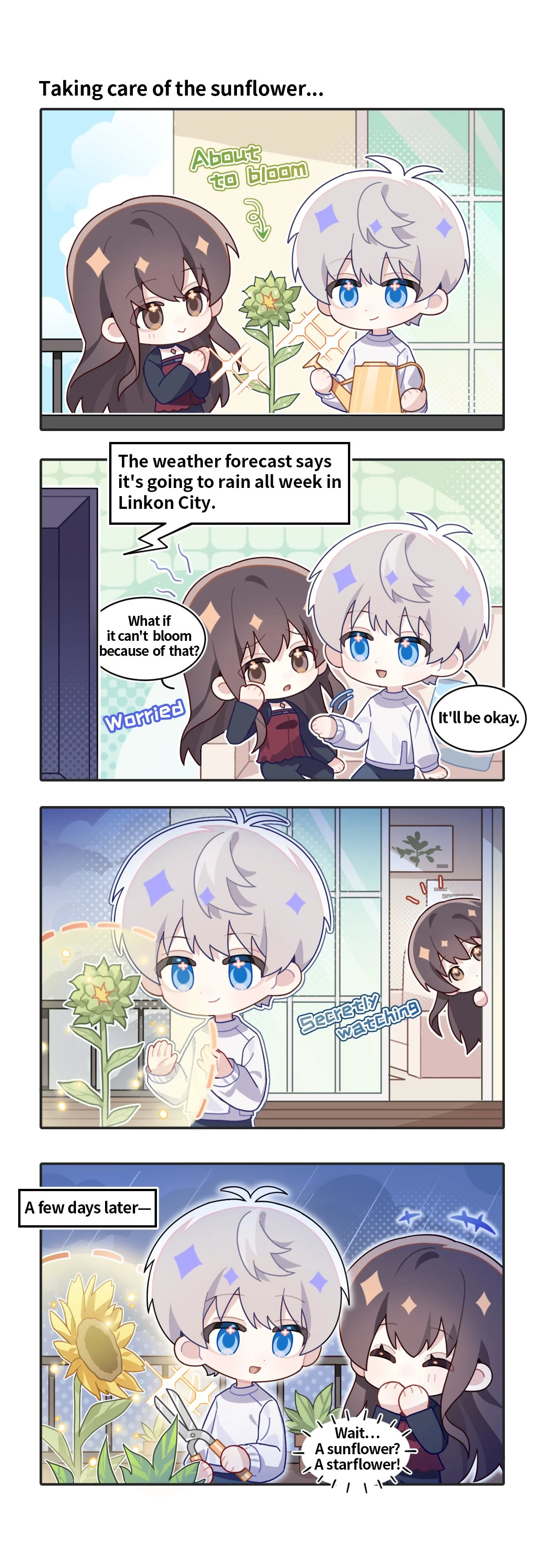 The sunflower you and he planted together is finally about to bloom! Rainy days ahead?