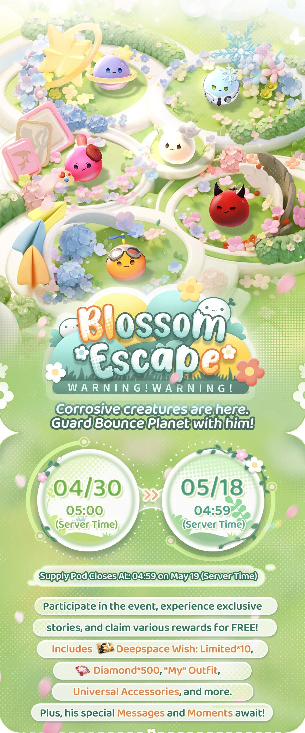 Participate in the event, experience exclusive stories, and claim various rewards for FREE! Includes [Deepspace Wish: Limited*10], [Diamond*500], "My" Daily Outfit, Universal Accessories, and more. Plus, his special Messages and Moments await!