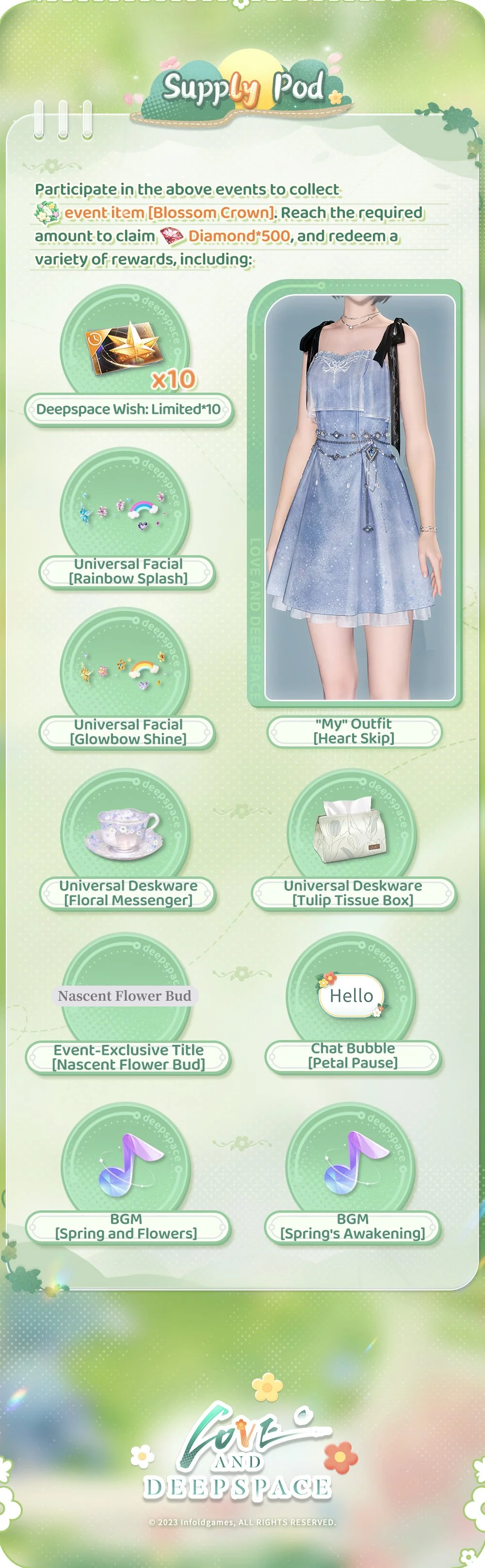 Participate in the above events to collect Blossom Crowns. Reach the required amount to claim [Diamond*500], and redeem a variety of rewards, including: