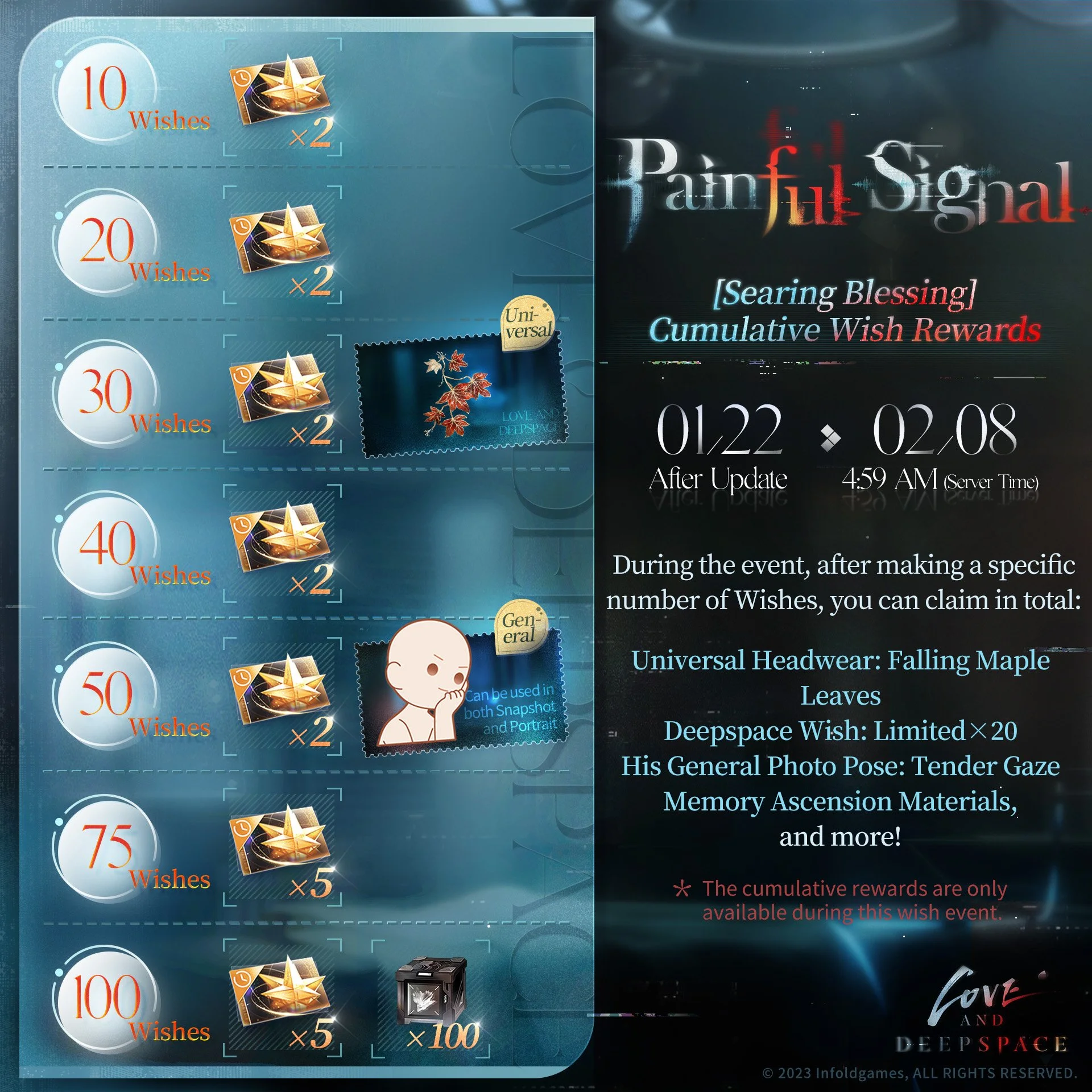 During the event, after making a certain number of wishes, you can claim rewards including [Universal Headwear: Falling Maple Leaves], [Deepspace Wish: Limited*20], His General Photo Pose [Tender Gaze], Memory Ascension materials, and more.