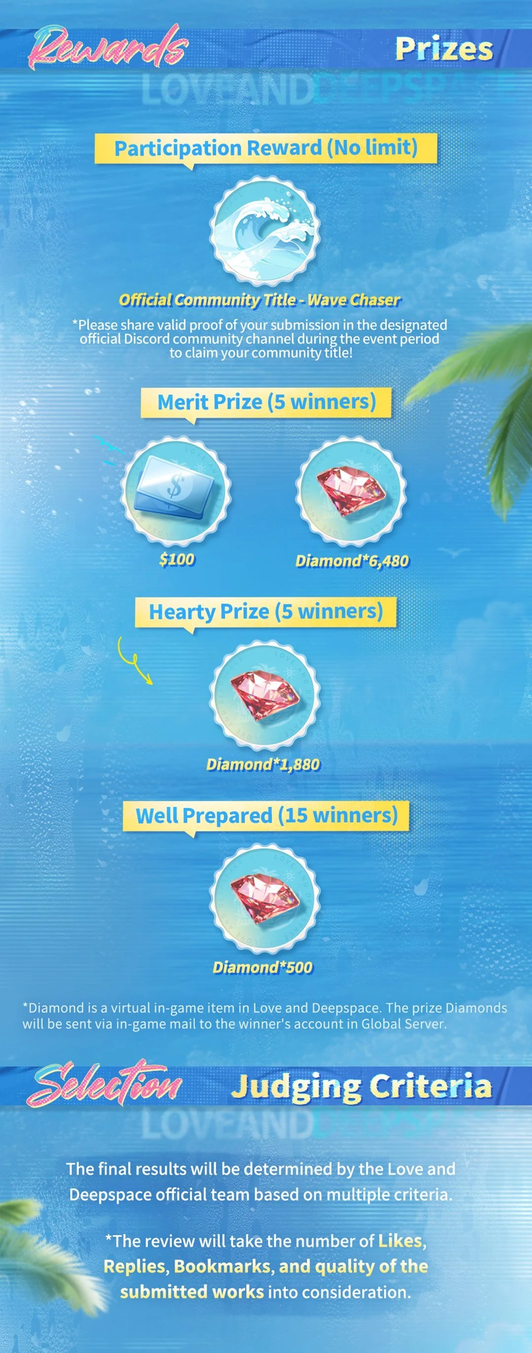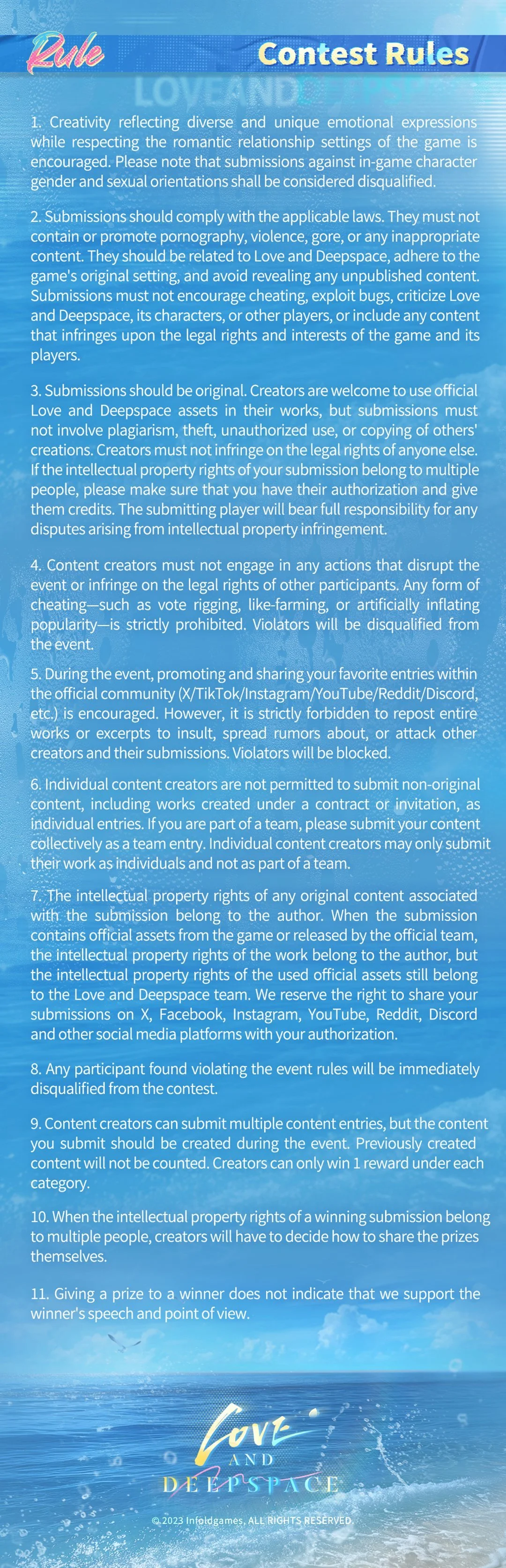 During the event, post your original work with both the hashtags #LoveandDeepspace and #LoveandDeepspaceHeartwave on X/TikTok/Instagram/YouTube/Reddit/Discord, and complete the submission form as required.