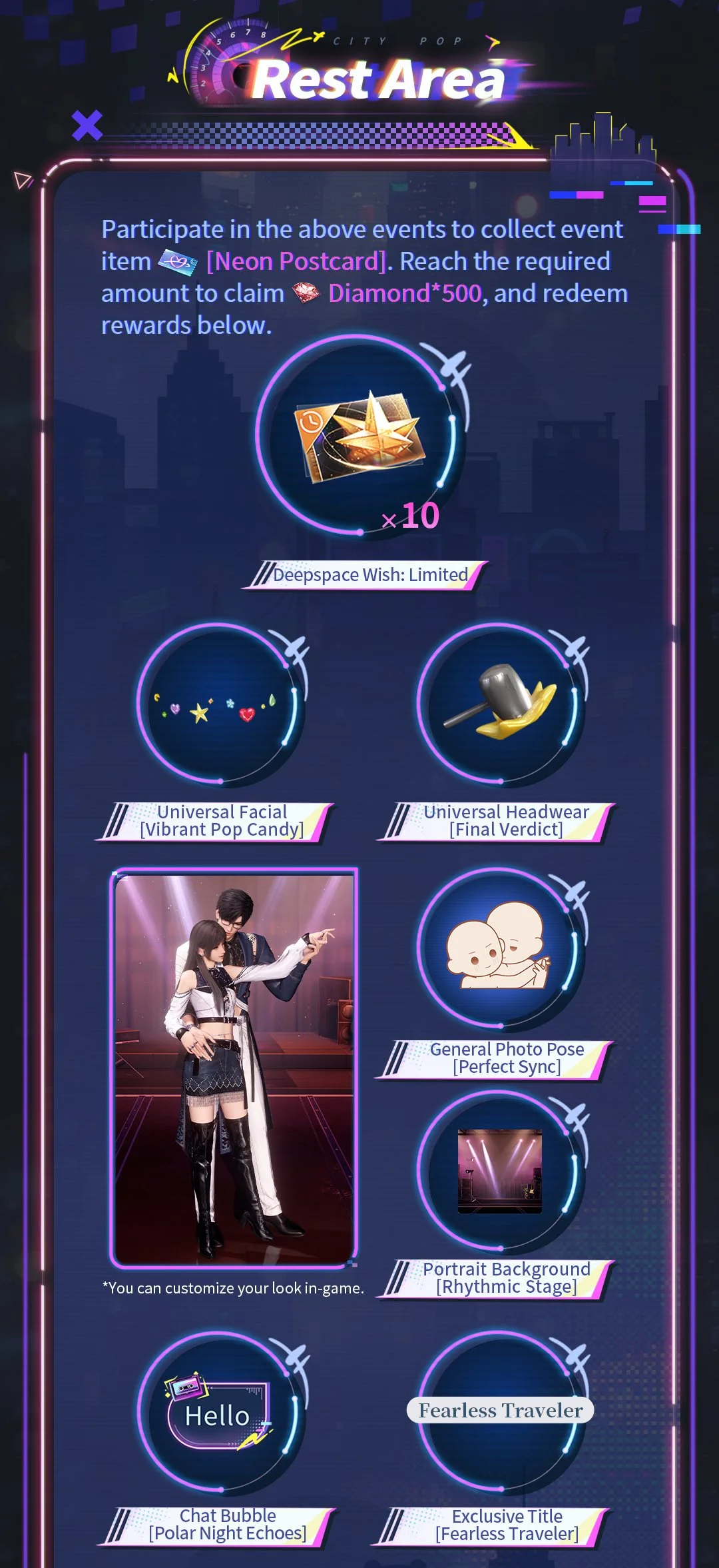Participate in the above events to collect the event item [Neon Postcard]. Reach the required amount to claim [Diamond*500], and redeem various rewards, including: