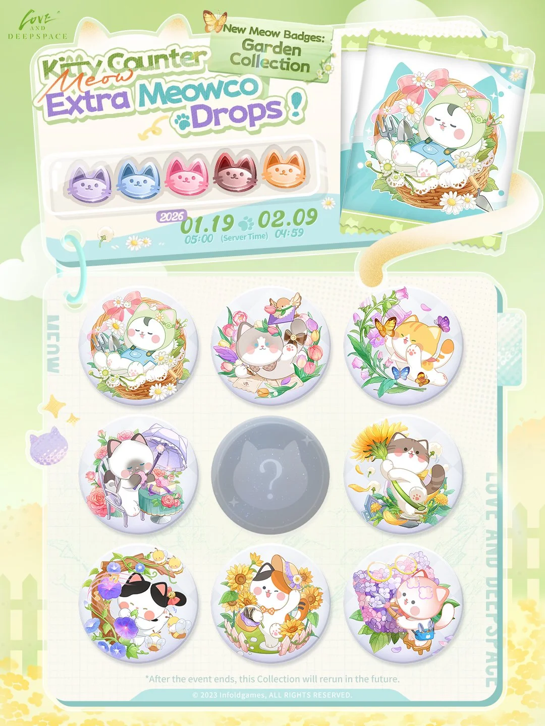 Collect exclusive Meowcos and visit the Kitty Counter to draw from the brand-new Meow Badges Series: [Garden] Series!