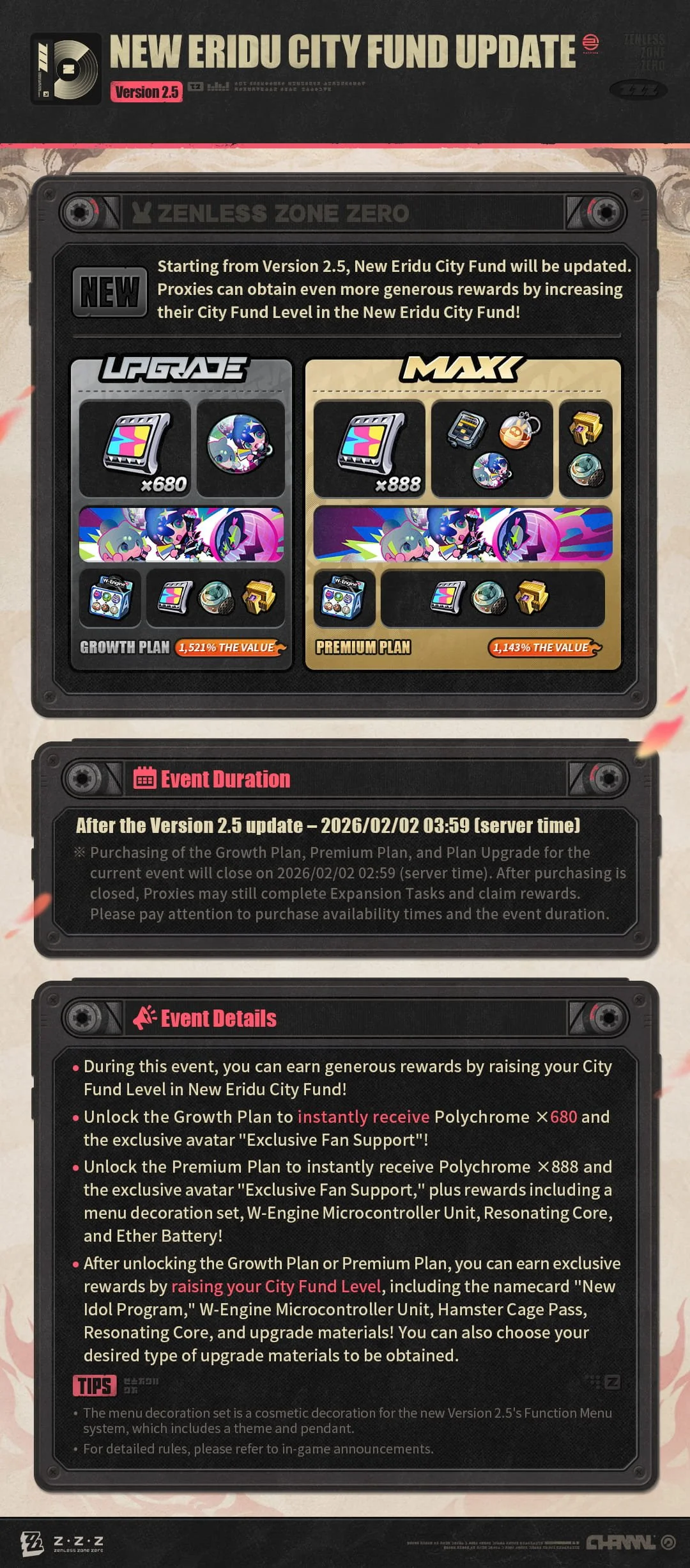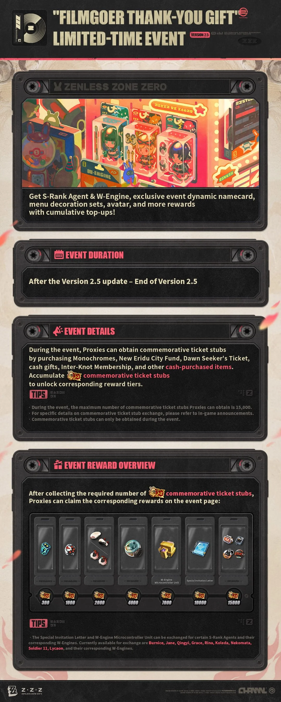Hey Proxies! Today, we're bringing you a rundown of Version 2.5's limited-time event "Filmgoer Thank-You Gift," the all-new New Eridu City Fund, limited Signal Searches "Exclusive Rescreening" & "W-Engine Reverberation," and updates to the store. Let's check it out together!