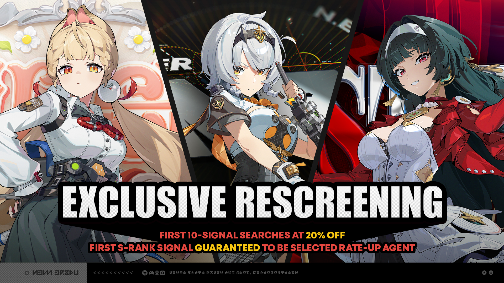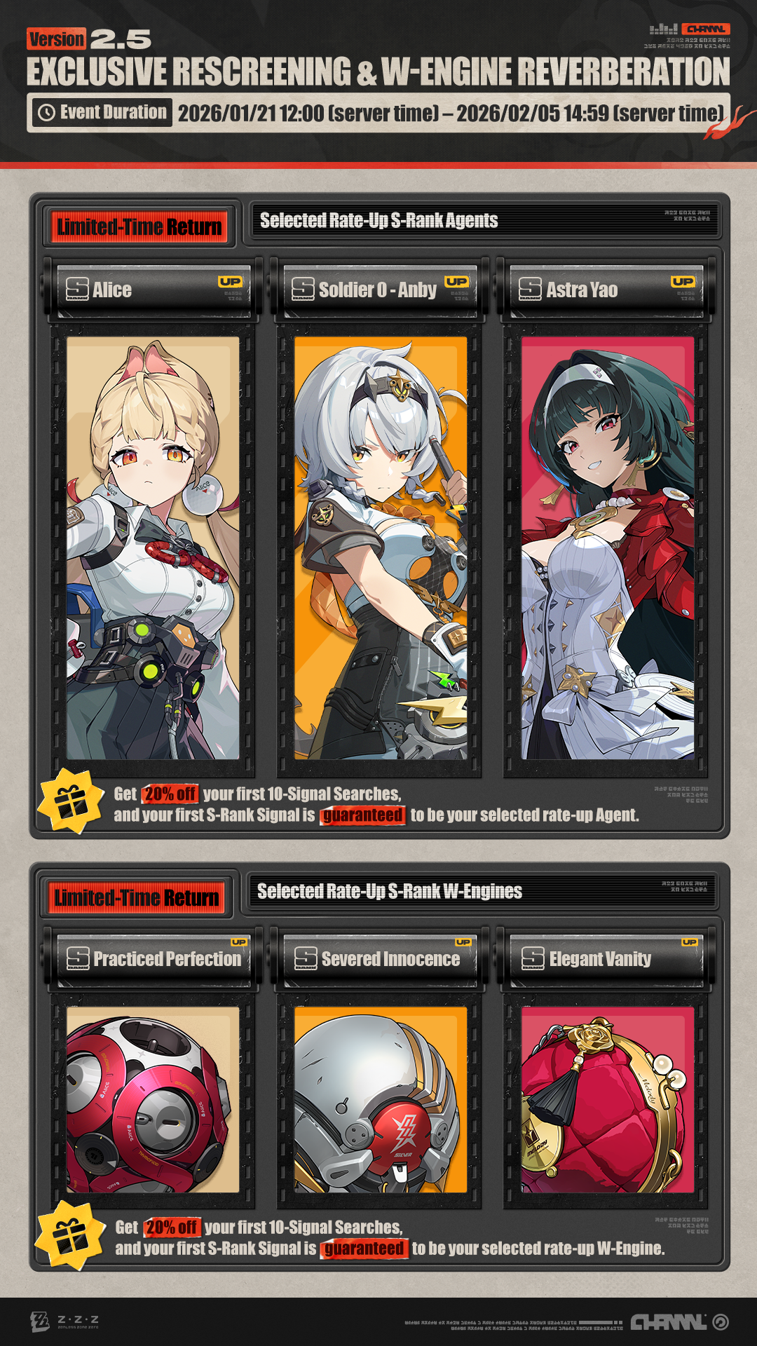The first S-Rank Signal obtained from the Exclusive Rescreening channel is guaranteed to be the currently selected limited S-Rank Agent (this guarantee mechanism is referred to below as the "Special Guarantee"). In this period's channels, the limited S-Rank Agents available for selection include: Alice (Physical - Anomaly), Soldier 0 - Anby (Electric - Attack), and Astra Yao (Ether - Support). Proxies can switch tabs on the Signal Search page at any time to change the featured Agent.